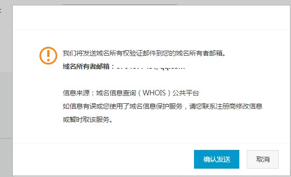 4、系统将获取您域名所有者邮箱,发送域名所有权验证邮件到您的域名所有者邮箱。单击"确认发送"。