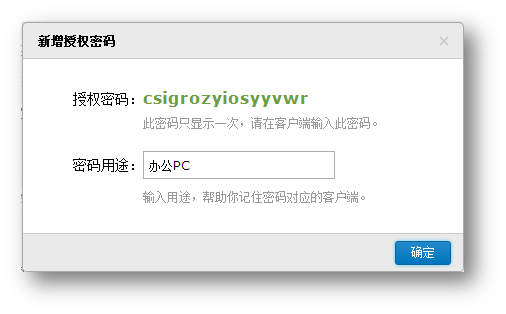 点击"新增授权密码",页面会显示的授权密码。您可以复制此授权密码粘贴至客户端,授权密码将不再显示。您还可以为授权密码登记用途,以便管理同步邮箱的客户端。