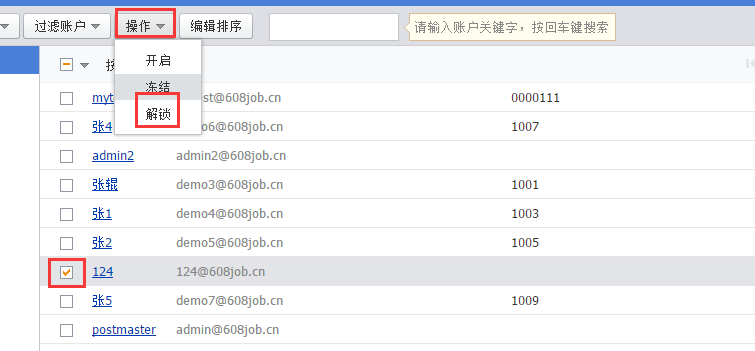 域帐号管理——员工帐号管理——搜索到需要解封的帐号——选中帐号——操作——解锁